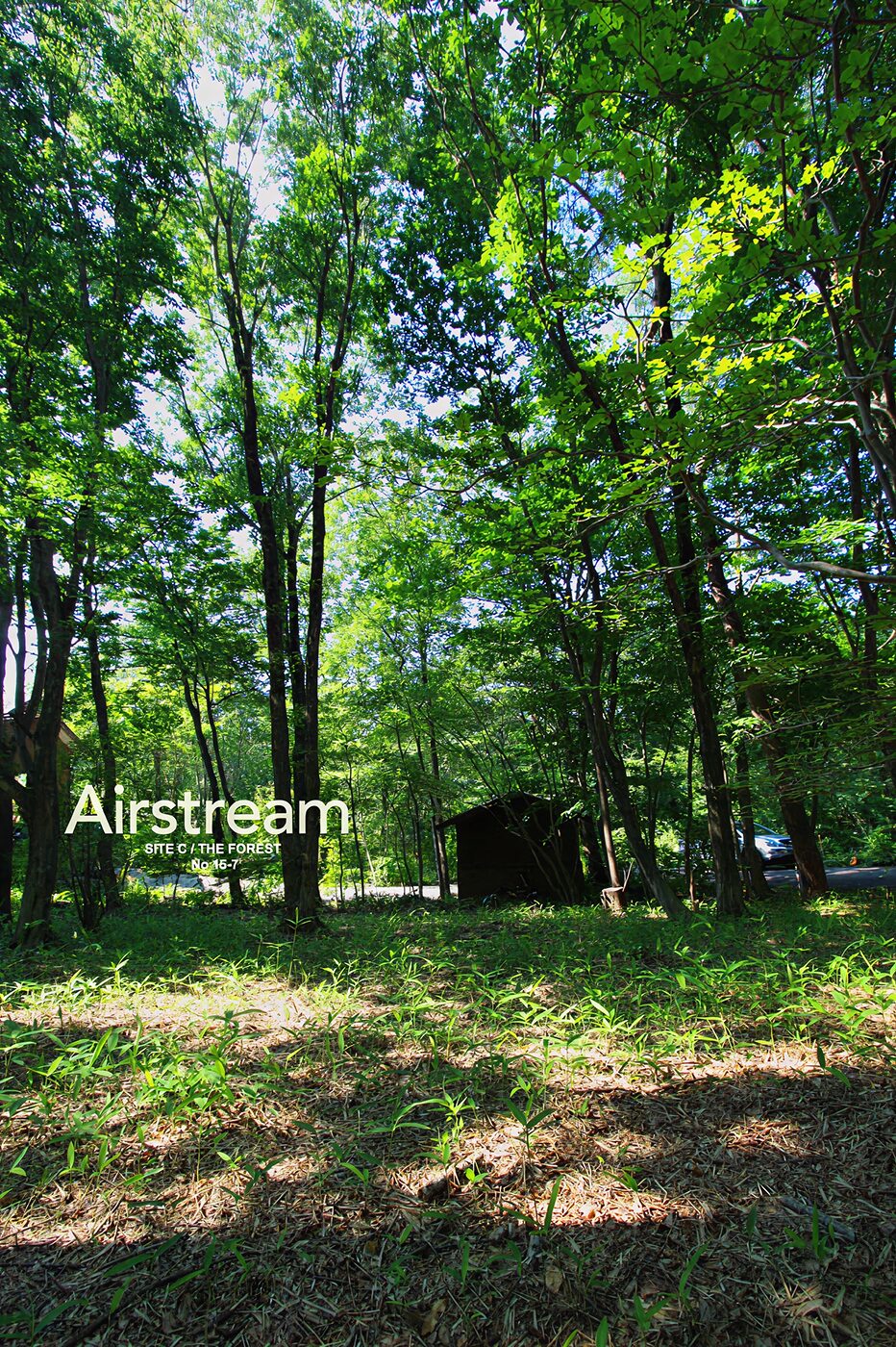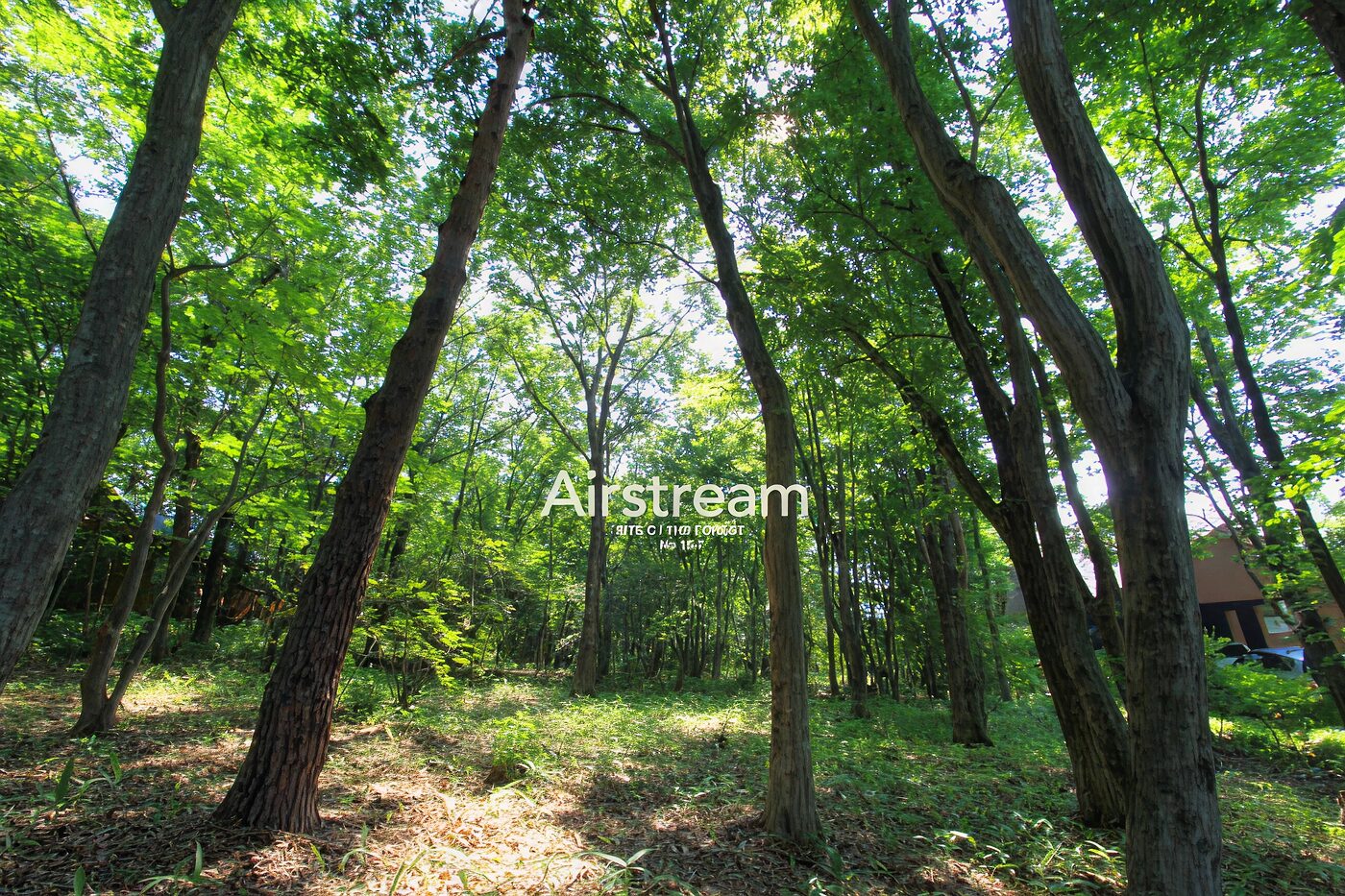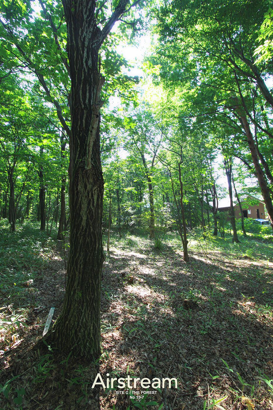 バランスよく育った樹木の間に、エアストリーム(キャンピングカー)を建物として置いたら、とても似合いそう。タープやガーランドフラッグを貼ったり、樽風呂を置いたりして自分流のキャンプコロニーができそうな土地。