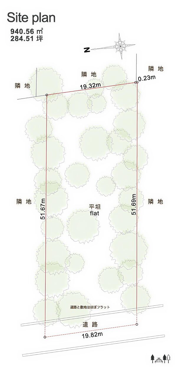 敷地と道路はほぼフラットな関係。20m近くある間口と50mを超える奥行きをもつこの土地はスケール感バッチリ。テニスコート4面分より少し小さいくらいの広さです。