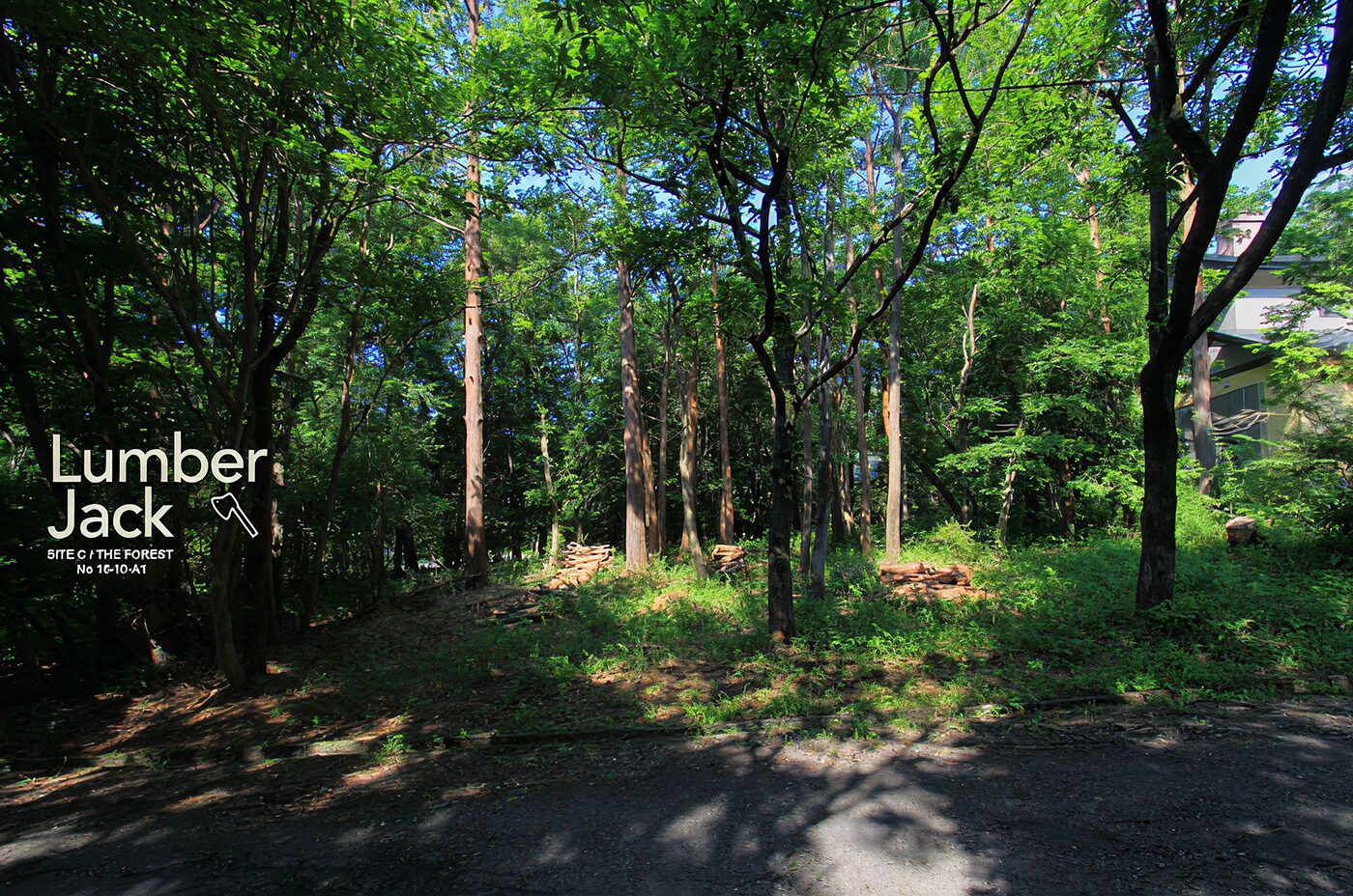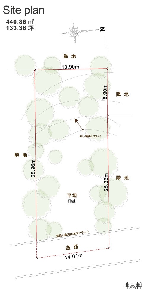 バランス良い感覚で敷地内に辰木立の美しさが印象的な土地。空の青と木々の緑がダイレクトに感じられます。奥に行くと少しずつバンクする敷地はほぼフラット形状。